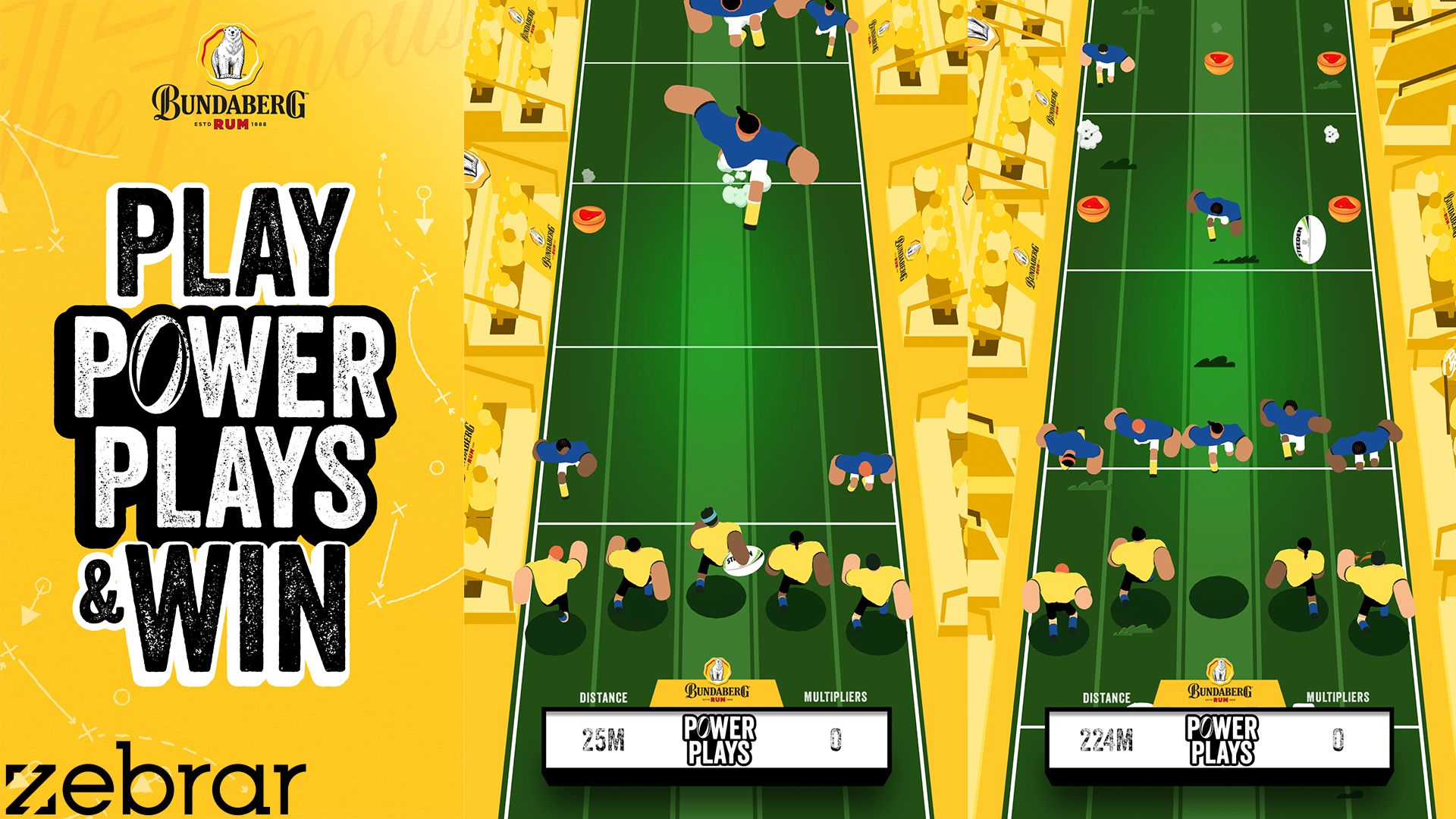 As part of a promotion for Bottlemart customers, Zebrar designed and built this stylised, Bundy branded endless runner game. Accessed through the Bottlemart app, players would swipe left and right to pass the ball to their teammates, maneuvering through lanes to avoid the opposing team and obstacles, as well as to pick up collectables to win points. Players that topped the leaderboard each week won a prize.